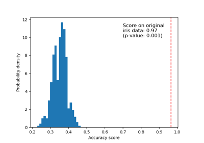 >>> from sklearn.datasets import make_classification >>> from sklearn.linear_model import LogisticRegression >>> from sklearn.model_selection import permutation_test_score >>> X, y = make_classification(random_state=0) >>> estimator = LogisticRegression() >>> score, permutation_scores, pvalue = permutation_test_score( ... estimator, X, y, random_state=0 ... ) >>> print(f"Original Score: {score:.3f}") Original Score: 0.810 >>> print( ... f"Permutation Scores: {permutation_scores.mean():.3f} +/- " ... f"{permutation_scores.std():.3f}" ... ) Permutation Scores: 0.505 +/- 0.057 >>> print(f"P-value: {pvalue:.3f}") P-value: 0.010